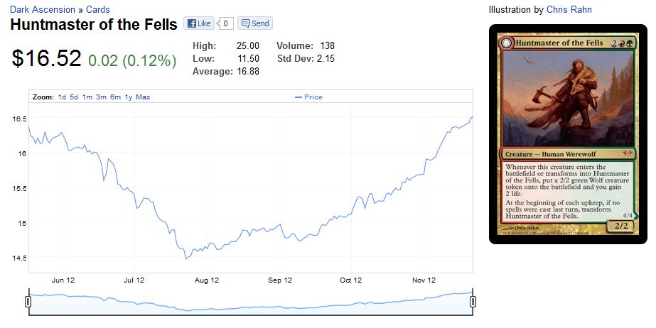 I have been bullish on Huntmaster of the Fells // Ravager of the Fells (chart from blacklotusproject.com) since his price bottomed a couple months ago. He’s been a 4-of in many successful Jund lists at SCG Opens. And being a Mythic Rare from Dark Ascension, his potential upside is significant… once people break down that apparent price barrier of $20. For some reason he’s bumping into a ceiling that Geist of Saint Traft hasn’t dealt with.