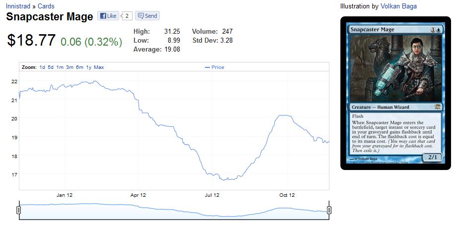 In fact, Snapcaster Mage may see increased play again should this be the case. It may return to $20 but its price cap does seem fairly firm in that region (chart from blacklotusproject.com).