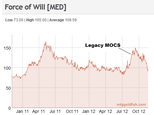Depending on how popular these events are, there could be a large fall in the prices of many Legacy and Classic staples from these sets. Down the road, it's wise to anticipate another Legacy MOCS, such as the one that occurred this past summer on August the 18th. The result of having a high profile tournament online was to stoke interest in Legacy, pushing up the price of many Eternal cards. This type of seasonal swing is the bread and butter strategy of investing in Eternal staples on MTGO. Fluctuating interest drives prices up and down, creating opportunities for speculators. Legacy on MTGO is no different from Modern in this regard.