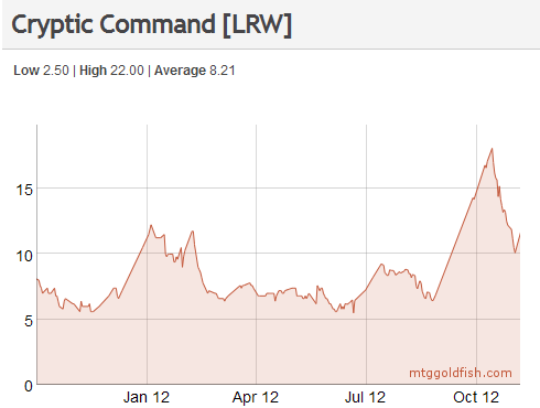 Cryptic Command (12.05 tix): Bought 15 copies at an average of 8.10 tix. Similar to Creeping Tar Pit, the results of GP Lyon reminded players that Modern is not all Jund, all the time. At it's current price buying more feels a little risky, especially keeping in mind last year's in-season price peak of around 15 tix. Note that the mtggoldfish charts are produced using data from the Supernova bots price list. Occasionally there are gaps in the data when the bots are out of stock and the charts start using buy prices instead of sell prices. This is why last year's in-season price peak of 15 tix does not appear on the chart; the price peak occurred while Supernova was out of stock.