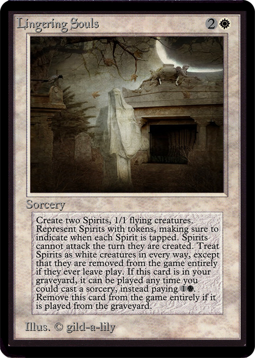 Lingering Souls ($1.75) came up in Spirit Jund and in the Gifts deck. It's a power uncommon from an under-drafted set. Lingering Souls is going to be worthwhile for a long time, in spans of years. Let's just put it this way on this card: Spectral Procession ($2.75) is a worse card and it's worth nearly twice what Lingering Souls is. Do you see Lingering Souls getting played in four years? I do. That card is steady - you play it and the first copy keeps you from dying and the second makes you win.