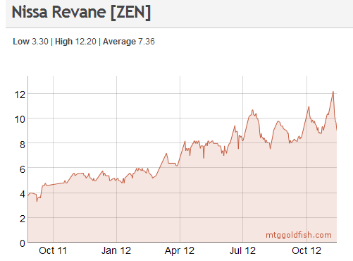 In the chart below, the price bottom of Nissa Revane is clearly visible just prior to rotation in October 2011, followed by a steady up trend over the course of the year. A price peak is observed just prior to the end of Zendikar redemption, followed by a sharp decline.