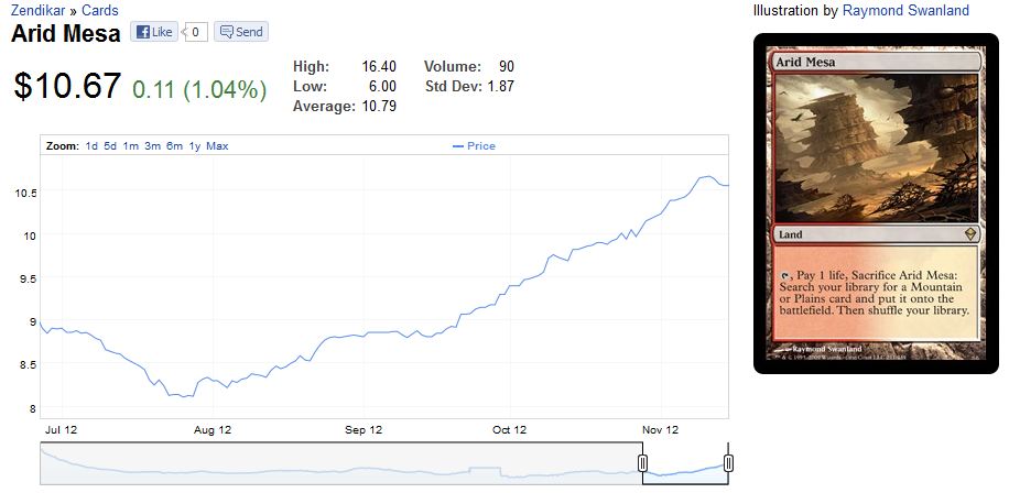 So if I bought a few Arid Mesas at $8.50 a few months ago and sold recently, did I maximize profits? Arguably, no. Everyone expects non-blue Zendikar Fetch Lands to follow their blue counterparts and see a significant price bump due to Modern. But to me profit is profit. And selling those Arid Mesas freed up my cash so that I can speculate in something else. This ensures high turnover in my stock and shields me from significant risk of holding cards which are not top performers.