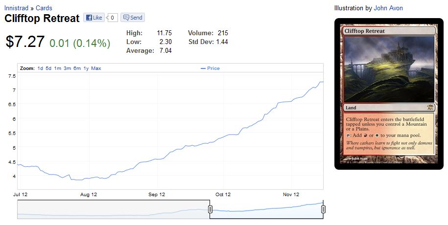 Clifftop Retreat (chart from blacklotusproject.com) has gone from $4 to $7.50 in about the same time period. Not only is this a greater absolute gain vs. Arid Mesa, but the percentage gain is substantially higher. Arid Mesa has seen a 25% increase while Clifftop Retreat has risen 67% in that same time frame.