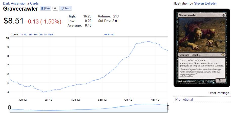 Because of these price fluctuations, I’m often quick to sell when I can profit. If I had purchased several copies of Gravecrawler at $4 back in July (I think I did, actually), I’d be inclined to sell them as quickly and as conveniently as possible as the card’s price rises. Therefore, when a desperate dealer offered $6 on the card, I was more than happy to sell. Even though the card was still on an upward trend, I was way too concerned that there would be a significant price drop. Rather than extend the risk of owning this card, I was sure to move it right away.