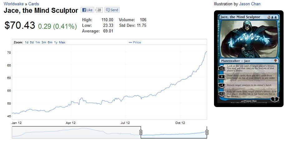 Because I didn’t want to be stuck holding a $75 card (opportunity cost), I started pushing the extra Jace. But there were no takers. Already I had felt like I was destined for a loss with potential for greater downside. The loss was so unbearable that the first dealer to offer me $70 was the proud owner of a new Jace. (chart from blacklotusproject.com)