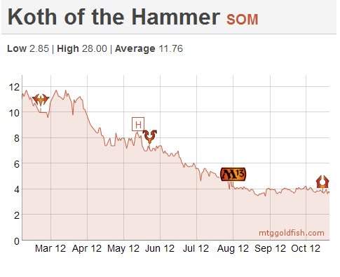 If you look at the chart below, Koth of the Hammer's price saw a price drop and then a small bump in the period after Dark Ascension's (DKA) release events. This was probably due to players selling cards they were not using for tix to play in release events. The bounce back in price occurred at the end of release events as the focus shifted to constructed formats.