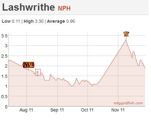 Although the Mono Black Infect deck didn't last long as a competitive threat, it enjoyed a few strong weeks as a metagame choice. Smith's work, and his audience, helped to popularize the strategy. The financial winner of all this was Lashwrithe of New Phyrexia. Lashwrithe could combine with any Infect creature and make a one-shot killer.