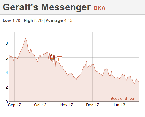 Both Geralf's Messenger and Gravecrawler show a steady decline in recent months, and two tix is near their floor. Buying in at around 3 tix exposes you to about 1 ticket of downside with 2 to 3 tix of upside. If a Black based aggro strategy supplants Mono-Red as a popular choice, then these cards will get closer to Hellrider's price of 9 to 10 tix.