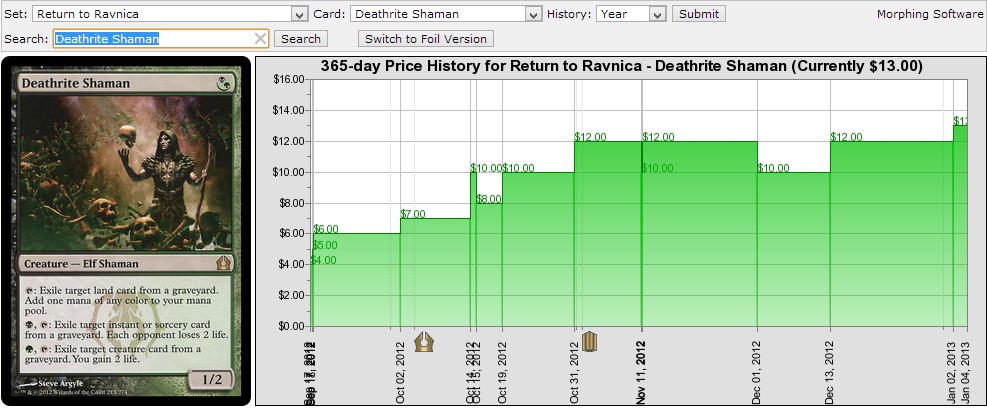 - http://ark42.com/mtg/pricehistory.php?s=Return+to+Ravnica&c=Deathrite+Shaman&d=365
