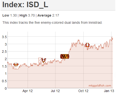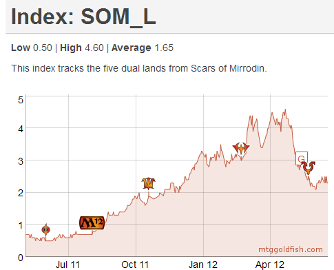 Prices peaks for SoM duals were observed during Dec 2011-Feb 2012, and prices on ISD duals look set to make their own highs in a similar period this year. I think it’s reasonable to expect the shocklands as a group to follow this pattern, so yes, I expect the projected prices for the RtR shocklands as a group to materialize this time next year.
