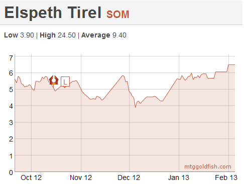To see evidence of this effect, look at the chart for Elspeth Tirel below (charts courtesy of mtggoldfish, which takes its pricing data from supernovabots). The bottom occurs early in December, about two months after Scars block rotated out of Standard. Since then it has seen steady price increases.