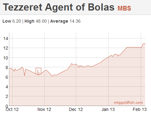 The chart for Tezzeret, Agent of Bolas is similar (see below), but in this case the bottom occurred in early November and the subsequent increases in price have been bigger. Both charts exhibit the predictable effect of redeemers buying up mythics from sets that have just rotated out of Standard. Paying attention to these patterns and buying up these cards, after they rotate and thus become "worthless," has been a consistent way to make profits on MTGO.