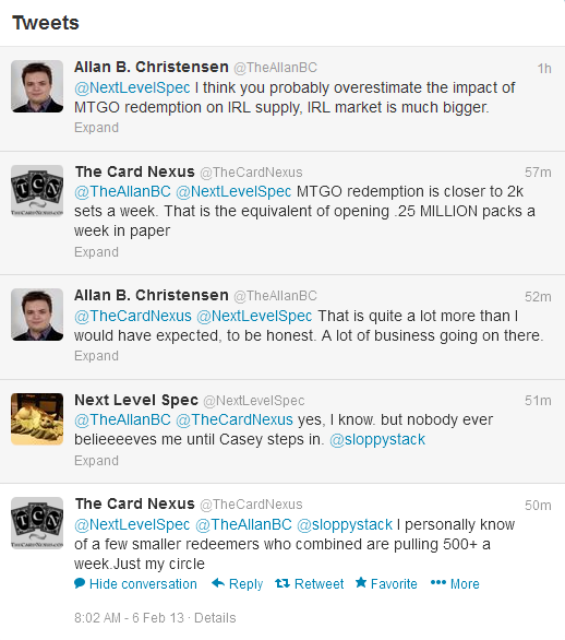 This week, WoTC announced that the per-set surcharge for redemption would increase from $5 to $25. Set redemption has become a large enterprise, and people have estimated that 2000 sets are redeemed each week. Here's a Twitter conversation from a few days ago (Feb. 6th, 2013), that included Ted Knutson (@NextLevelSpec) and Casey, the owner/operator of The Card Nexus (@TheCardNexus).