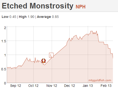 As a set, NPH offers very little value to redeemers lately. Since the start of 2013, the ratio for NPH has been very high compared to other redeemable sets. This means that there is little demand to prop up the value of junk mythics in this set. This trend is obvious if you look at the price chart for Etched Monstrosity.