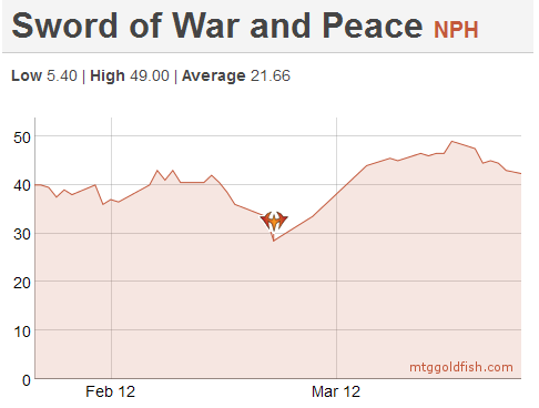 Last year, there was some opportunity in both Elesh Norn, Grand Cenobite and Sword of War and Peace. Both cards tanked in price prior to Dark Ascension releases events for no apparent reason. Both cards rapidly recovered their price once the short term pessimism or need for tix dissipated. The timing of the fall in price and subsequent rise is a little different for each card, but both give an idea of what is possible for short term opportunities in cards from last year's sets. Have a look at the charts below to see how quickly prices can change on MTGO.