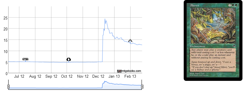 Aluren -- This was artificial inflation, and was the first we saw. However, the card is down to $12.69 due to sellers constantly undercutting each other to get rid of them while they decrease.