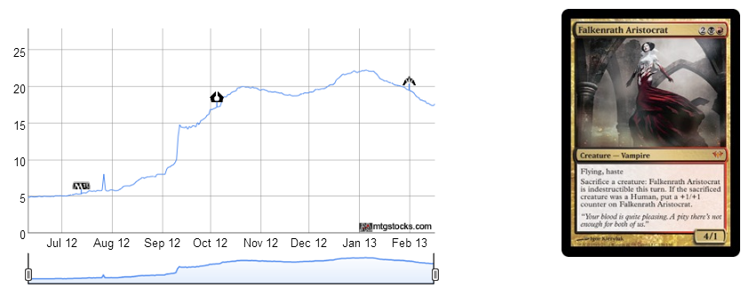 Falkenrath Aristocrat is a great card to look at right now. I might be trying to turn my Huntmaster of The Fells into these, now that they have hit $35. You can make the assumption that Falkenrath Aristocrat only decreased in value because Huntmaster of The Fells increased.