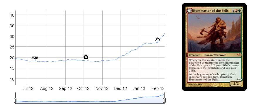 Huntmaster of the Fells –- This card has been on our radar for quite a while and has finally passed the $30 mark. Since it has replaced Bloodbraid Elf in Modern Jund, it could potentially become the next $40+ Standard mythic. We may be close to sell right now, but I see it gaining popularity, not losing it.