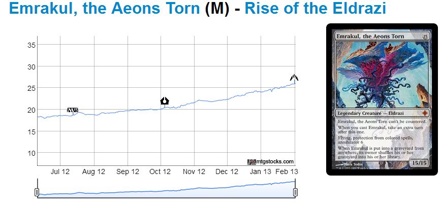 The first cards that come to mind are the popular Eldrazi Mythic Rares: Emrakul, the Aeons Torn, Kozilek, Butcher of Truth, and Ulamog, the Infinite Gyre (chart from mtgstocks.com).