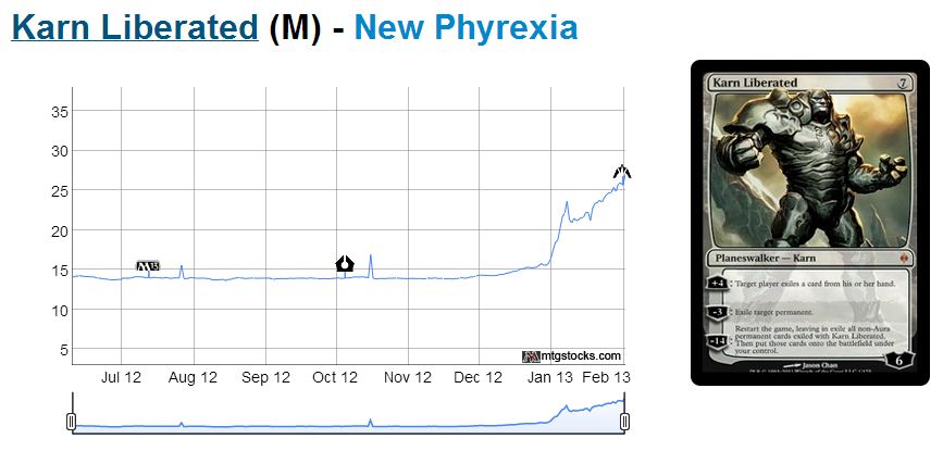 But the ridiculousness doesnāt stop here. People have assumed that any Modern deck not hit by the B&R announcement will increase in popularity, and therefore value. For example, I was thrilled to unload my Karn Liberated in trade right before the colorless Planeswalker rotated out of Standard. Apparently that was just plain wrongā¦(chart from mtgstocks.com):