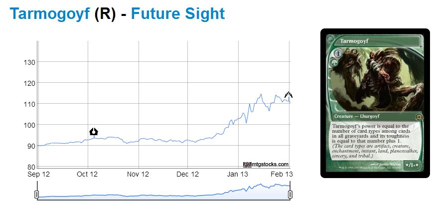 If you are obsessed with the original artwork, then itās not terrible to hold Tarmogoyf. The Future Sight version shouldnāt drop as much. But this is the one card we already know is going to be in Modern Masters. Demand will decrease slightly when Standard PTQ season begins and then an influx of supply will take place. These two events happening back-to-back will deflate the price of this long-beloved two drop.