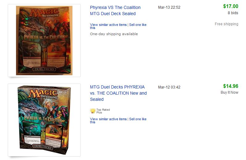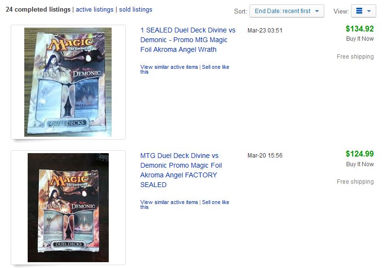 - I for one am completely shocked at the price of some Duel Deck products. Elves vs. Goblins ($249.99), Divine vs. Demonic ($149.99), and Jace vs. Chandra ($99.99) have all paid for themselves many times over. I wish I had these! Meanwhile Ajani vs. Nicol Bolas, Venser vs. Koth, and Phyrexia vs. the Coalition have all been a bust. Fortunately the rest have also increased marginally in price. This is why I see investment in these products as somewhat risky – you could increase your money fivefold or sit on a stagnant position for years depending on what you buy!