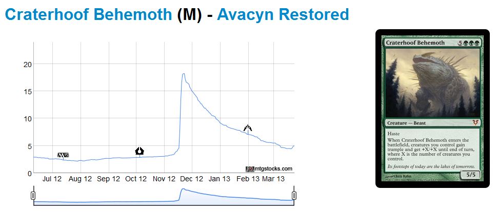 Craterhoof Behemoth is an odd one. It too is a Standard play, but one with a much different risk equation. The chart from mtgstocks.com tells the whole story for this creature.
