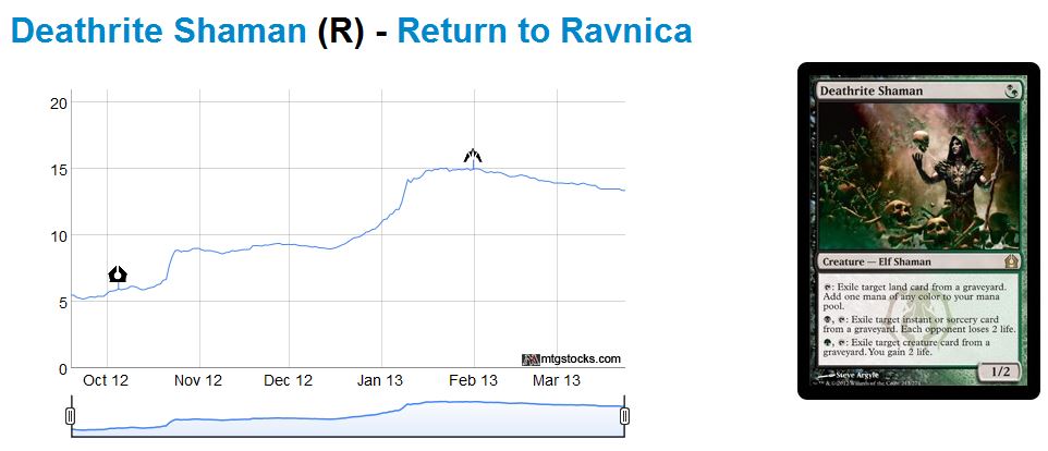 - I think it’s noteworthy to highlight Deathrite Shaman’s recent pullback. Even SCG has 25 copies in stock at $12.99. Considering the card once traded at $20, this is a significant drop. Although I regret picking up a couple copies near this price, I still have high hopes for the longer-term prospects of this Eternal staple.