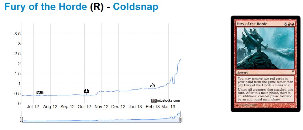 I just made a post in the forums about this too, but my knowledge of the rise of Fury of the Horde was this deck http://forums.mtgsalvation.com/showthread.php?t=4… . I was also mentioned in Brainstorm Brewery. I would think that the adoption of such a deck for Modern brewers would be a reason for Fury and Goryo’s Vengeance trending upward, aside from Vengeance’s use in Legacy TinFins.
