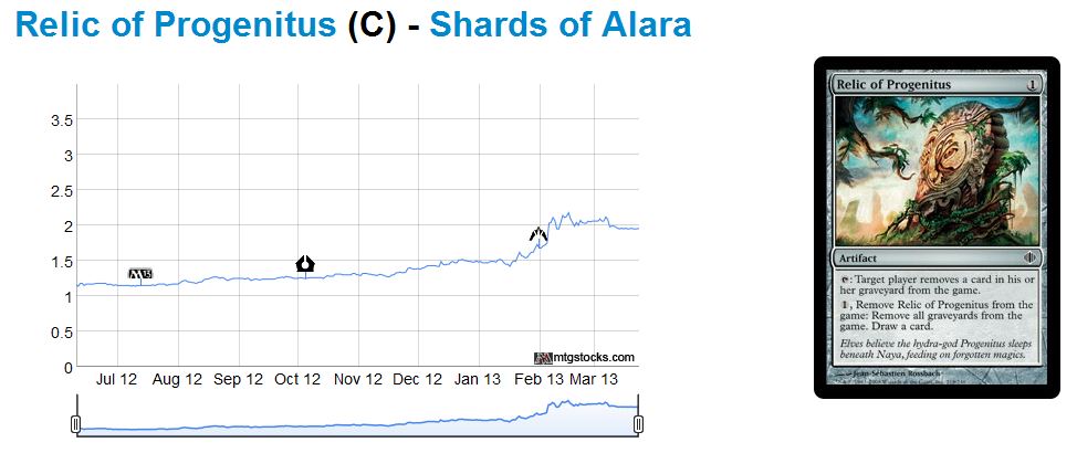 During this down time, it’s a great idea to do some housekeeping with collections. Last time I had some free time I sifted through my bulk to find the newest quarter commons and fifty cent uncommons to move to my trade binder. Stuff like Ponder has really increased lately. And have you noticed what Relic of Progenitus has done as well?