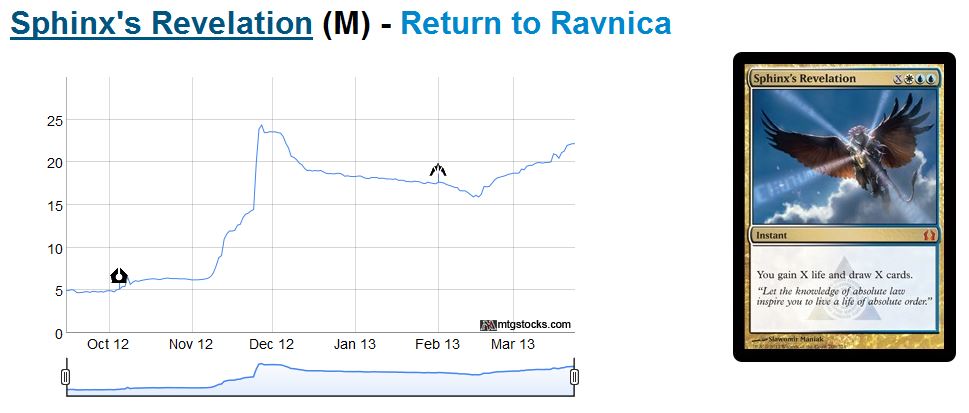 I consider Sphinxs Revelation a mainstay of Standard, and with Standard PTQ season arriving, I am a believer. I know I show the mtgstocks.com chart for this white and blue instant every week, but with good reason. I saw the card was rising over the past couple weeks and this trend has continued.