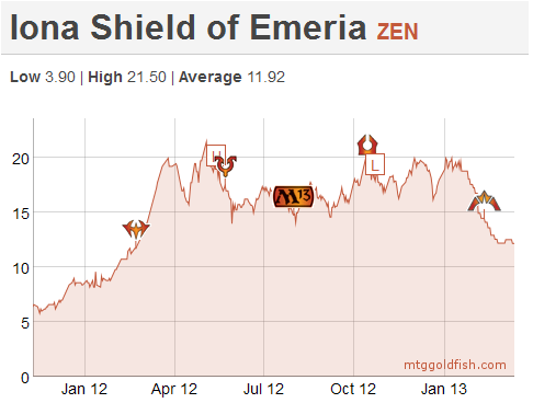 Another card which holds value from ZEN is Iona, Shield of Emeria. This card has been stable in the 16-to-20-tix range for most of the last year. It's an occasional reanimation target in Modern Gifts Ungiven decks. Also an angel! Although redemption no longer supports the price of ZEN mythic rares, Iona is another card that took a big hit from the ZZW queues and has not bounced back. Buy this laggard at current prices of 12-13 tix if you are willing to hold for 8+ months.