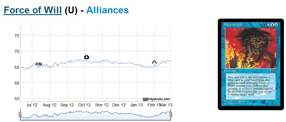 Fair enough – though Force of Will is one of the most widespread cards in Legacy. So many decks aren’t functional without Force. So if a new player wants to try Legacy and pick up Goblins, I suppose Force and Natural Order are bad examples you are right. But if Force of Will isn’t moving, then it’s likely that Legacy as a whole isn’t moving.