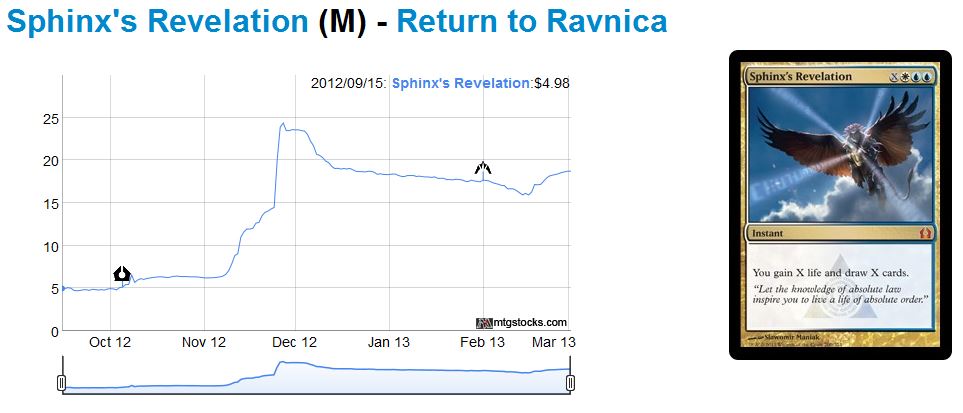 Standard PTQ season is next, and the format is currently well balanced. This will likely lead to a healthy season with increasing demand of many staples. If the player base continues to grow, even cards from Return to Ravnica will appear short in supply, causing the price of some cards like Sphinxs Revelation to increase appreciably (chart from mtgstocks.com).