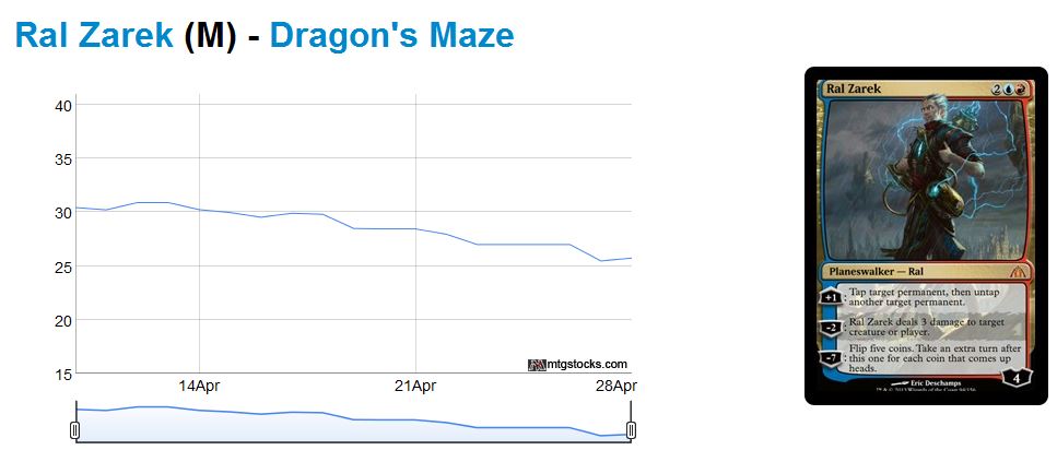 As for Dragon’s Maze cards, are there any worth keeping at the moment? Well, despite hearing how infrequently people opened Ral Zarek, I still think you should sell him the moment you touch him. Looking at his price chart, he’s already been on a decline and I see that continuing in the short term.