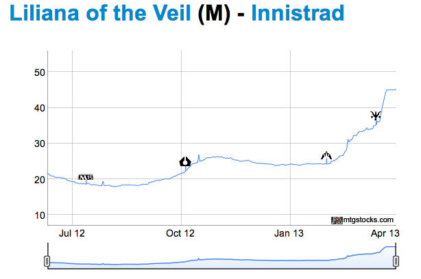 Liliana of the Veil has been an extremely interesting card to watch. The emergence of Jund in Legacy really flipped the switch on this card, turning it into a $50 āwalker. Just this week foils began to spike out of control.