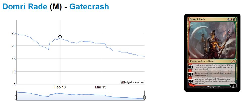 Last night was particularly tricky for me. A few of the cards I was unloading I was admittedly selling at a small loss. This includes Domri Rade (chart from mtgstocks.com), which I will boldly claim is not done dropping in the short term.