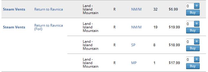 Sure, SCG’s price on NM copies of Steam Vents are probably a buck too high to really be a decent price. But since SCG pays a 25% trade in bonus on buy list orders, you could do worse than sinking some credit into Steam Vents, even if their price is 20% too high. Plus there’s always upside potential from sitting on Shock Lands. Foil prices are also reasonable, albeit a tad higher than I’d like.
