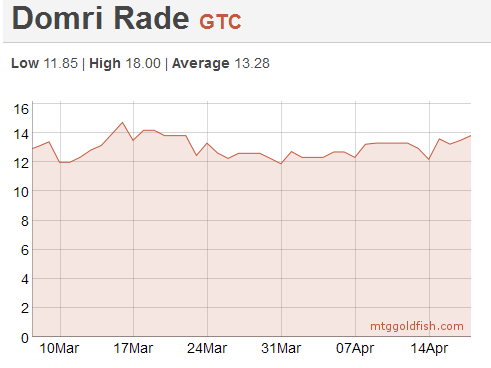 Domri Rade is a 12-13 ticket card that sees sporadic play in Block, Standard and Modern.