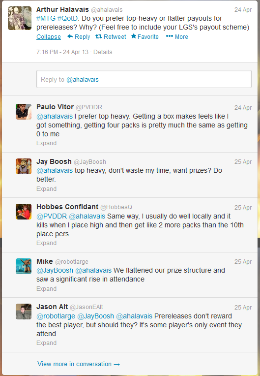 I enjoyed the article and have fallen into the same camp as Lee (and yourself) with regards to prize structure. I actually play at the most competitive LGS in our area…but they are always trying to get new customers and a flatter structure invites the casuals..though I did stop attending another stores prereleases after I split 1st (in a 55 person event) and got 6 packs…so there’s definitely a catch 22 with regards to prize structure.
