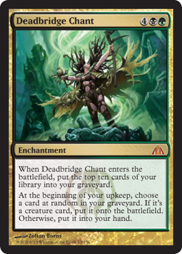 No one, not even the people like me who defended his combo potential, has talked much about scavenging regular dudes with decent mana cost-to-power/toughness ratios. It comes down early enough to matter, it's a nice followup to something like Grisly Salvage (Drown in Filth is another card I'm testing) and it got out of hand fast in Limited. He's not terrible with Deadbridge Chant -- taking smaller dudes out of your yard to guarantee any creatures you reanimate are big ones.