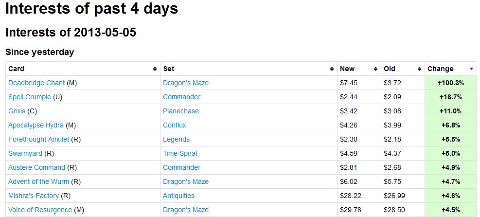 For starters, here’s the Top 10 Interests on mtgstocks.com for Sunday: