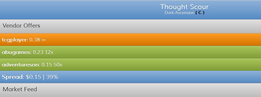 Some stores can afford to find these hidden gems because they have a ton of bulk copies. Finding that ABU Games will pay $0.23 for Thought Scour may be more useful because a store would likely have twelve copies to sell at once. This adds up much more quickly and justifies the pay. However, even this becomes questionable when dealers are only looking to buy a couple copies of a card.
