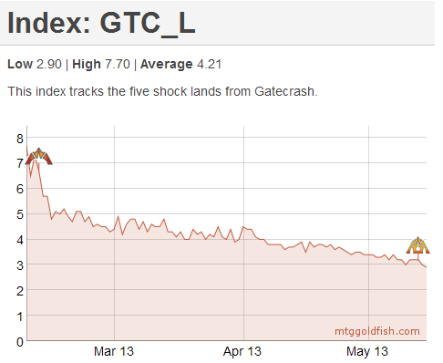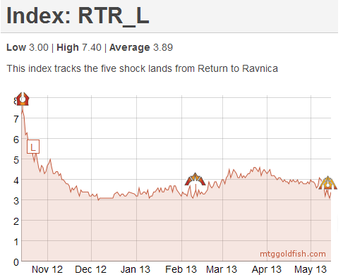 The chart for the GTC shocklands is still trending down. Based off of historical patterns, the next two weeks represent the bottom for the shocklands of Ravnica. Real estate is one of the most reliable speculative vehicles in Magic and I don't expect this year to be any different. Buying shocklands now with an eye to Fall Standard is a low-risk and profitable strategy to employ. Although I encourage readers to buy all the shocklands, I tend to weight my basket towards the under-used and thus low-priced shocklands.