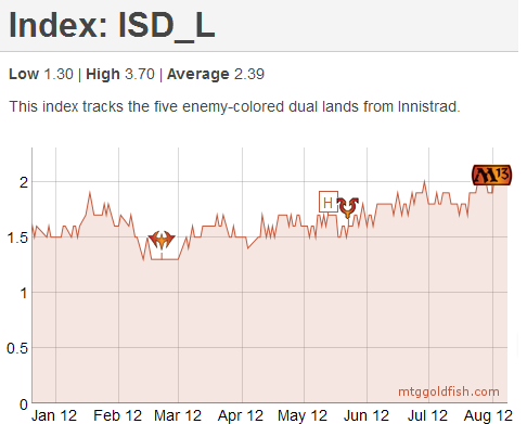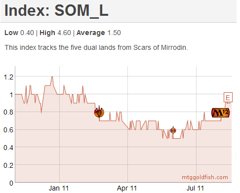 Have a look at the two charts below. They are reproduced from mtggoldfish and track the prices of dual lands from Scars of Mirrodin (SOM) and Innistrad (ISD).