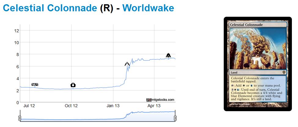 - If Standard’s not your thing, may I suggest Worldwake Manlands? These have been on a steady incline lately. They’re not in Modern Masters, and I expect them to increase further when Modern season returns. Honorable mention to Inkmoth Nexus for being like a Manland – this one is also solid.