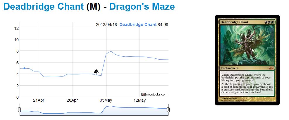 On quick flips like Wolfir Silverheart or, more recently, Deadbridge Chant, one must be highly engaged. The profit window may be a matter of a couple days before a card begins to decline again after an initial spike. Doesn’t it feel like this has become the norm lately, and not the exception? Doesn’t the chart below look familiar?