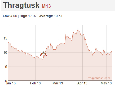 The chart looked favorable. Thragtusk had some price weakness prior to the release of Gatecrash (GTC), when it hit the 8-9 tix range. Following that, there was a period of price strength until the start of April.