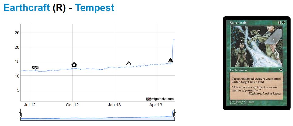 It’s not that I don’t think Earthcraft can be a $20 card…I just thought it would be $20 post-unbanning (after the original ridiculous spike). Now that Earthcraft has already jumped, I wouldn’t want to rush to buy a dozen copies should it become unbanned. It became a much more risky prospect.